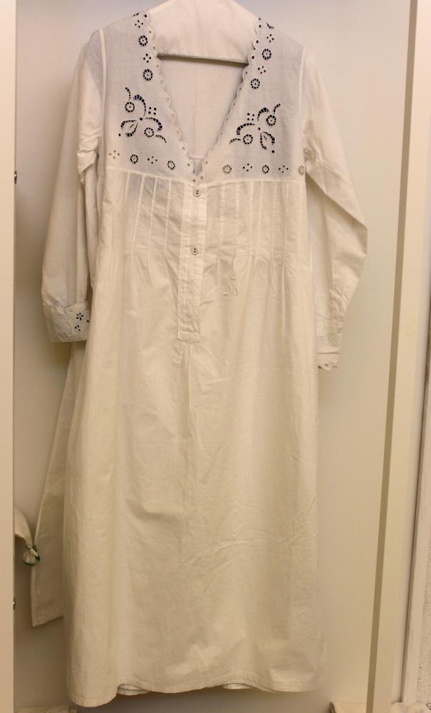 Náttkjóll - Síður náttkjóll úr hör. Pilsið saumað undir berustykki. Með síðum ermum. Leg allan hringinn undir sauminn við berustykki. Kílar upp í hliðum. Útsaumur á öllu berustykkinu sem er með v-hálsmáli. Útsaumaður tungukantur allt hálsmálið. Útsaumað uppslög á ermum með tungukanti. Allur útsaumur með enskum saum og hedebogrunnum. Tvær léreftstölur að framan á pilsi. Stafurinn H saumaður með frönskum saum, fyrir neðan vinstri boðung. - Saga: Haraldína, alltaf kölluð Helga, var afasystir Þórhildar. Haraldína Helga Sigurðardóttir var fædd 27. Sept. 1891 í Reykjavík. Vinnukona í Reykjavík 1910. Húsfreyja á Framnesvegi 10a, Reykjavík 1930. Húsfreyja í Rvík 1945. Gift Sigurði Jónssyni, 1880-1964. Þau eignuðust ekki börn. Frekari upplýsingar í fylgiriti 2337. Haraldína Helga Sigurðardóttir (1891-1985)