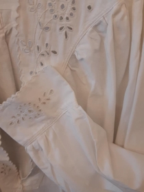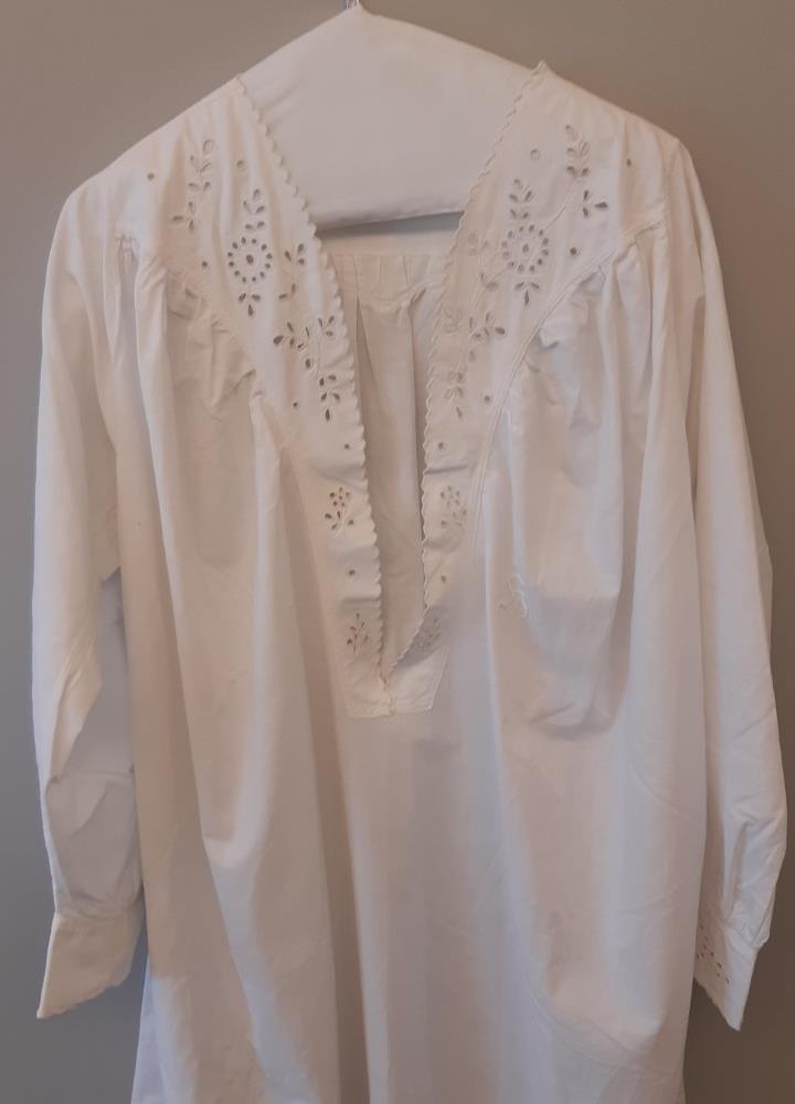 Náttkjóll - Hvítur lérefts náttkjóll með ermum. Flegin niður á nafla. Tungukantur á kraga saumaður út með kappmellusaum. Enskur og franskur saumur að öðru leyti. Einnig á uppáslögum á ermum. Langur kíll í hliðum. Leg aftan á baki við herðastykki. - Saga: Haraldína, alltaf kölluð Helga, var afasystir Þórhildar. Haraldína Helga Sigurðardóttir var fædd 27. Sept. 1891 í Reykjavík. Vinnukona í Reykjavík 1910. Húsfreyja á Framnesvegi 10a, Reykjavík 1930. Húsfreyja í Rvík 1945. Gift Sigurði Jónssyni, 1880-1964. Þau eignuðust ekki börn. Frekari upplýsingar í fylgiriti 2337. Haraldína Helga Sigurðardóttir (1891-1985)