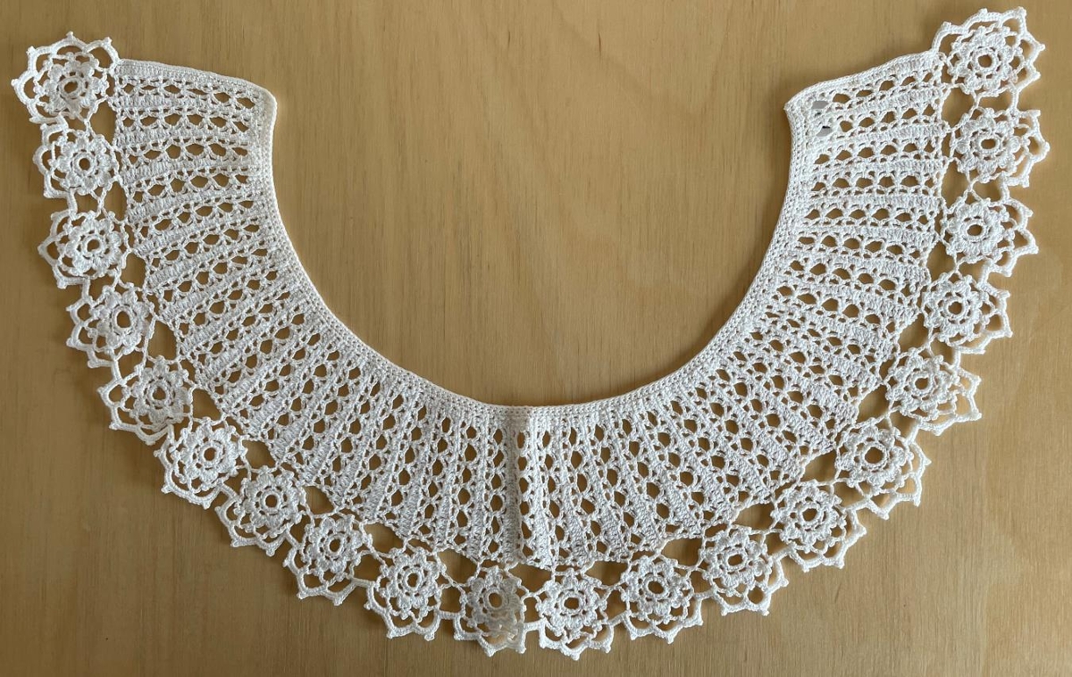 Hálskragi - Heklaður kragi úr hvítu garni. Blómakragi.