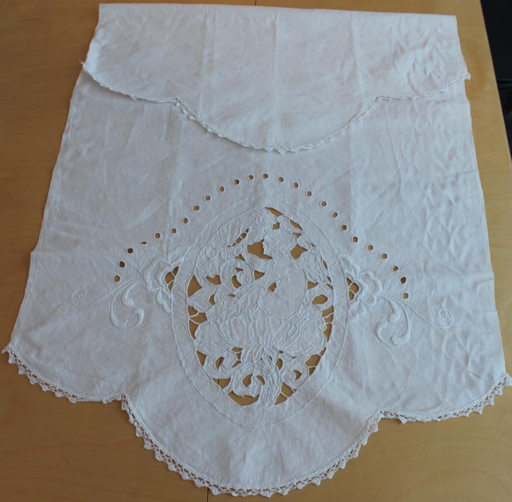 Puntuhandklæði úr hvítu hör lérefti. Puntuhandklæðið er saumað út með Feneyjarsaumi og flatsaumi. Mynd eftir Thorvaldssen.