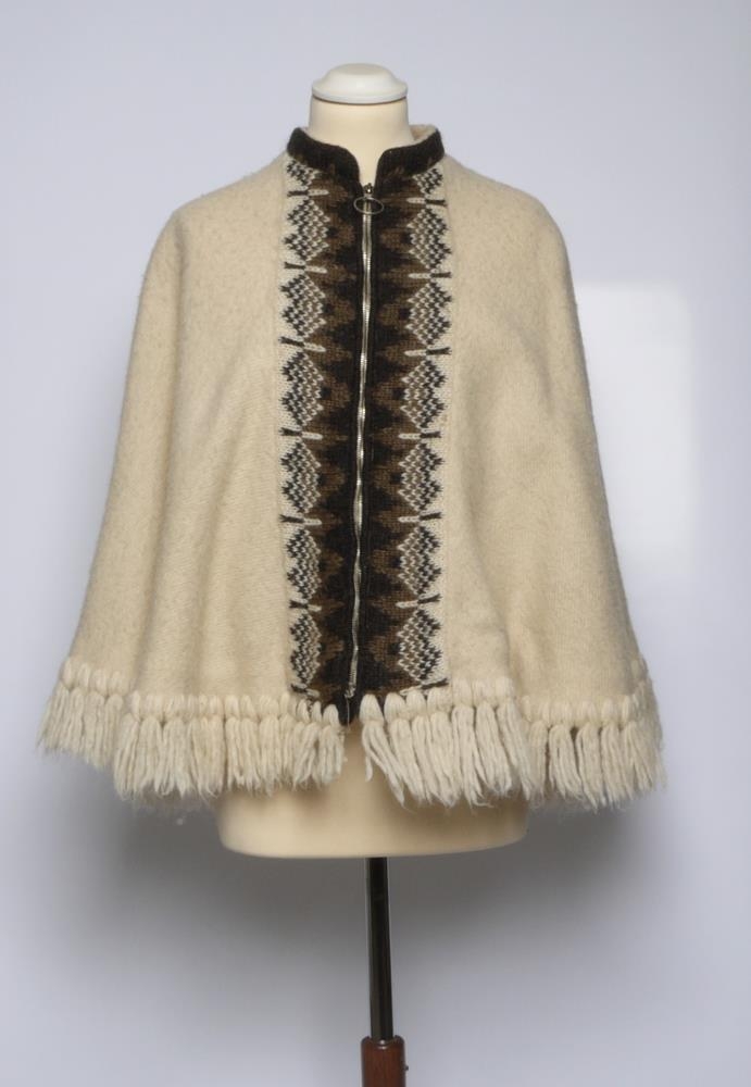 Herðaslá, hvít með rennilás. Kögur að neðan úr ísl. ull. Handprjónaður bekkur í sauðalitunum meðfram rennilás og hálsmáli. Var útflutningsvara m.a. til Bandaríkjanna á vegum Álafoss á sjöunda áratugnum. Var til dæmis til sýnis í verslun Hutzler's í Baltimore, Md. merkt "Sheepa" Icelandic Art. 100% Icelandic wool. Natural wool colours. Handknitted.