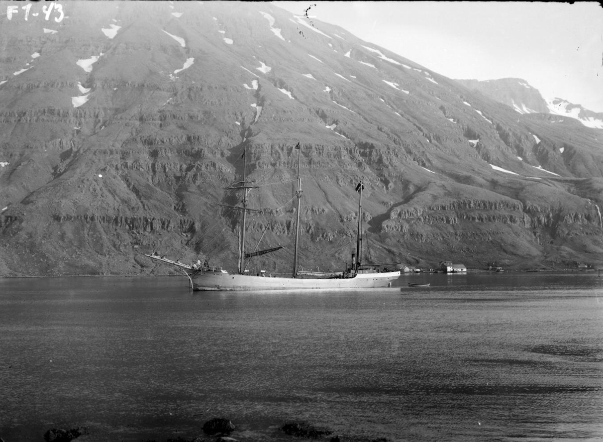 Þriggja mastra gufuskipið Maja á Seyðisfirði. Danskur fáni blaktir í aftasta mastri. Bakvið skútuna sjást hús.