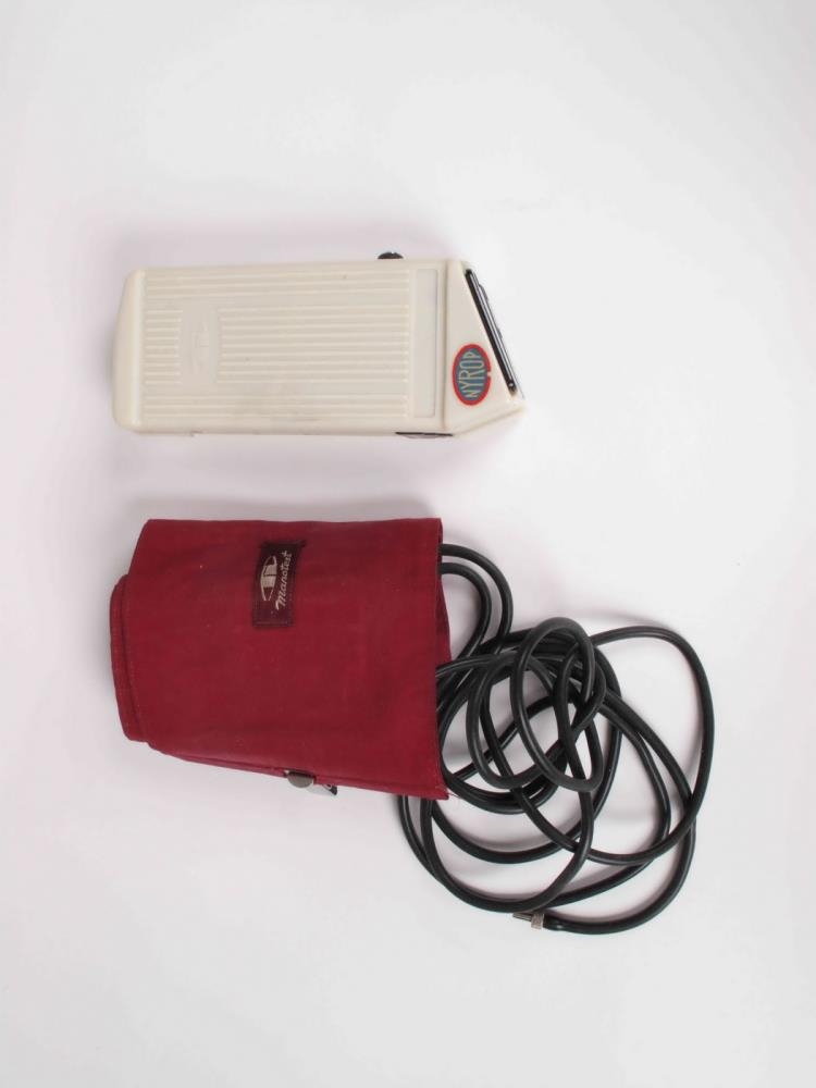 A: Blóðþrýstingsmælir MANOTEST TESTA-LABORATORIUM/ COPENHAGEN, í rauðri leðurtösku með rennilás, merki: NYROP, límt á takið. Það ónotað. B: Merkt: III/ Manotext, notað.