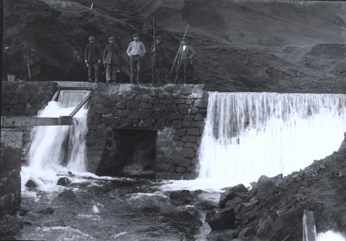 Stíflan við gömlu rafstöðina í Vík í Mýrdal. Frá vinstri eru: Jón Brynjólfsson, Erlendur Björnsson, Eiríkur Ormsson stöðvarstjóri, Jón Ormsson rafvirki og maður ókunnur.