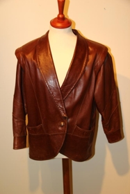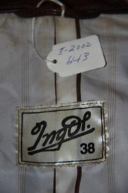 Brúnn leðurjakki úr sláttu lambskinni og fóðraður. Merki: Ing Ól - 38. Þegar Skinnu, skinnasaumastofu Sambandsins, var lokað á Akureyri setti Ingólfur Ólafsson klæðskeri upp saumastofu með konu sinni. Þau höfðu átt langan vinnudag hjá Fataverksmiðjunni Heklu og Skinnu. Ingólfur var í raun upphafsstjórnandi að skinnasaum á vegum Sambandsins á Akureyri. Stærð: 38.