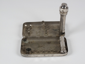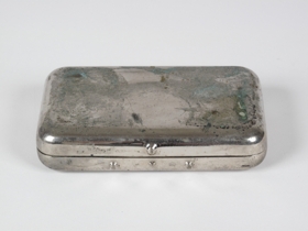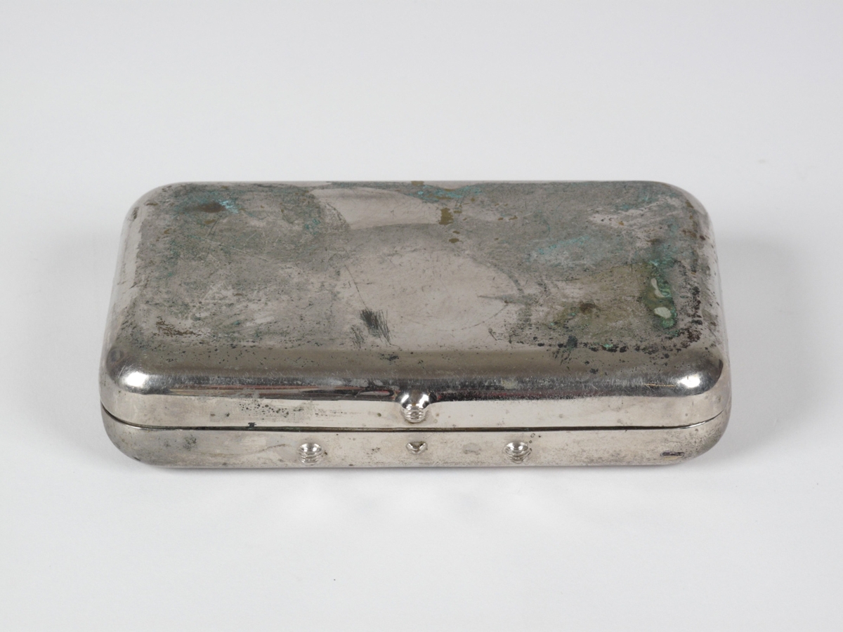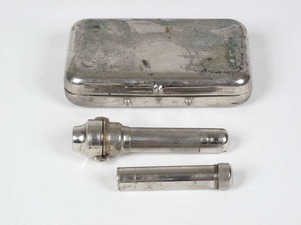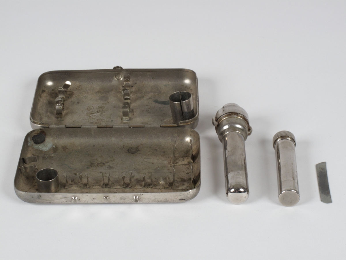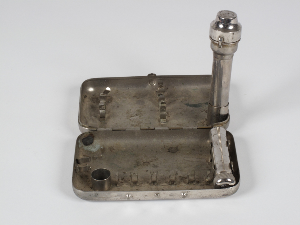 Krómaður málmkassi, merktur á loki: CORONA. Í honum eru hylki fyrir record spruatu (til geymslu á spritti) og annað fyrir nálar. Sprautu og nálar vantar. Úr Sjúkrahúsi Fáskrúðsfjarðar. Gunnlaugur Snædal dr.med. afhenti Nesstofusafni 10.01.1974.