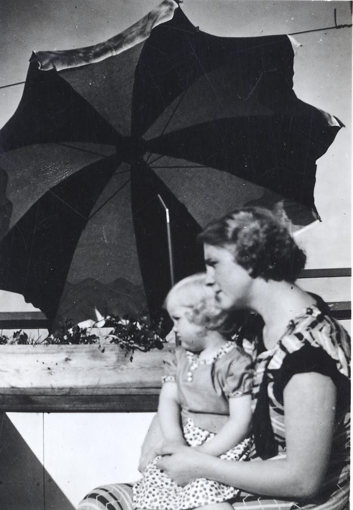 Mæðgur undir sólhlíf. Edda Ragnarsdóttir í fangi móður sinnar Ásfríðar Ásgríms.