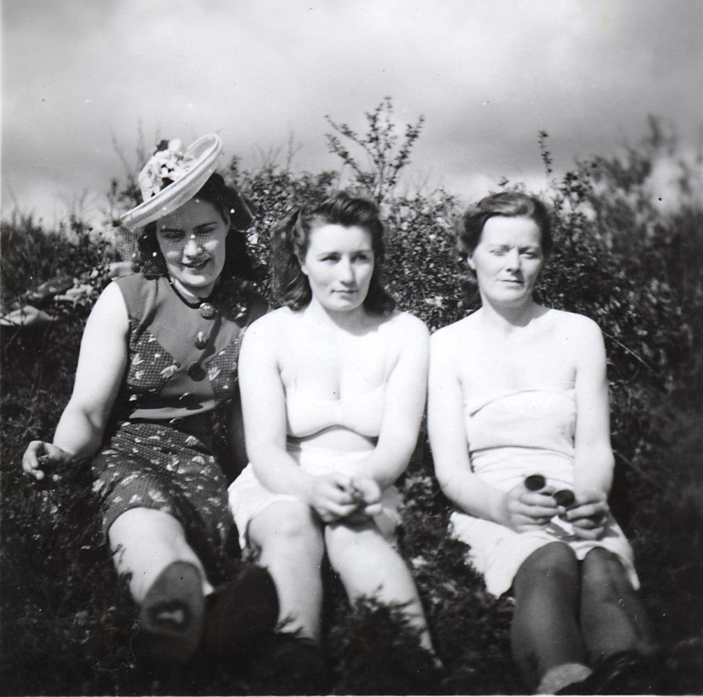 Þrjár konur í sumarklæðum úti í guðsgrænni náttúrunni. Lengst til hægri er Jóhanna Jónsdóttir frá Hraunkoti.