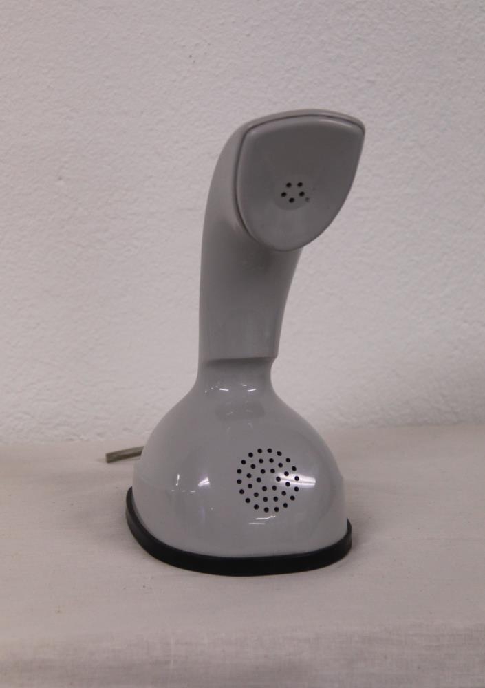 Síminn er grár að lit og stendur á svartri skífu en númer á hvítum grunni eru svört. Í miðjum fæti er rauður takki sem rífur talsambandið að loknu samtali. Merki: L M Ericsson. Made in Sweden.