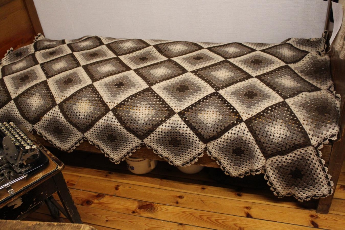 Teppi - Hekluð rúmábreiða í sauðalitunum. Gerð úr ferningum sem kastaðir eru saman og hekluð blúnda utanum, alls 59 ferningar. Þrinnað band. - Saga: Úr skrá H.B. 1961: Ábreiðuna vann Svava Jónasdóttir, Syðra-Fjalli, Aðaldal. Ég keypti hana fyrir 50.00 og þótti mikið í ráðist. - Hún hefur verið mín rúmábreiða tugi ára. Ábreiðan er á rúmi H.B. í safni.