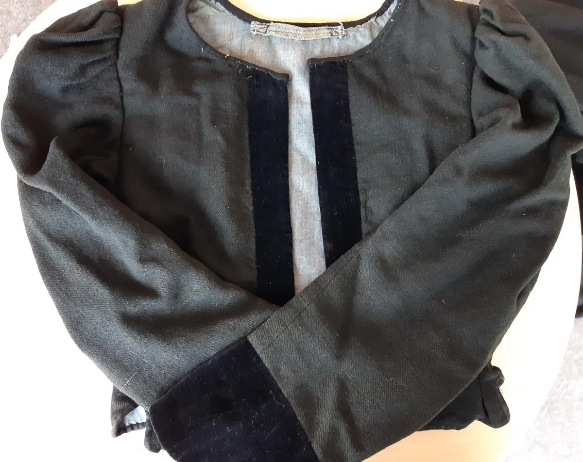 Peysa við peysuföt úr svörtu vaðmáli. Fóðruð með blágráu efni nema ermar. Á barmi og framan á ermum er bláleitt flauel.