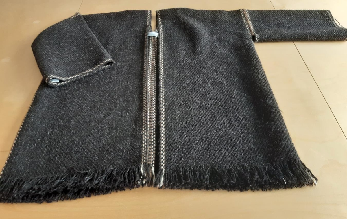Mussa - Ofið úr svörtu. Ofnir eru tveir dúkar og saumaðir saman í bak. Opið að framan. Tveir dúkar fara síðan í ermar. Ofnir eru tveir litir í kantana, mórrauður og hvítur. Saumað saman, með krosssaum á hliðum, í baki og í erma ísetningu. - Saga: Anna Halla var fædd á Siglufirði 5. Apríl 1947. Hún lést á líknardeild Landspítalans þann 27. Sept. 2010. Anna ólst upp á Sauðákróki og Hólmavík. Hún tók landspróf frá Héraðsskólanum að Reykjum árið 1962 og stúdentspróf frá Menntaskólanum á Laugarvatni árið 1966. Forpróf í málvísindum og hljóðfræði frá HÍ 1968. Nam vefnað við Statens Håndverk og kunstindustriskolen í Ósló 1969-1973 með diplom í vefnaði og kennarapróf í handmennt frá Statens Lærerskole í Forming, Notedden, Noregi 1977. Hún starfaði um skeið á eigin vefstofu í Osló. Eftir að hún flutti til Íslands starfaði hún sem handmenntakennari við Valhúsaskóla á Seltjarnarnesi um nokkurra ára skeið og síðan í nokkur ár hjá Frímerkjasölu Pósts og síma. Síðan hóf hún störf við handritadeild Þjóðarbókhlöðunnar og starfaði þar til dauðadags. Eftir Önnu Höllu liggur töluvert af vefnaði og öðrum verkum sem bera vitin um einstaka vandvirkni hennar og smekkvísi. Hún tók þátt í samsýningum veflistamanna eftir heimkomuna frá Noregi og var virkur félagi í samtökum þeirra. Hún óf veggteppi sem óskað var eftir að hún ynni fyrir safnaðarheimili Árbæjarsóknar og safnaðarheimilið í Vestmannaeyjum og fyrir sjúkrahúsið Akranesi. Töluvert af vefnaði Önnu Höllu er til í eigu ættingja og vina hennar. Anna Halla Björgvinsdóttir (1947-2010)