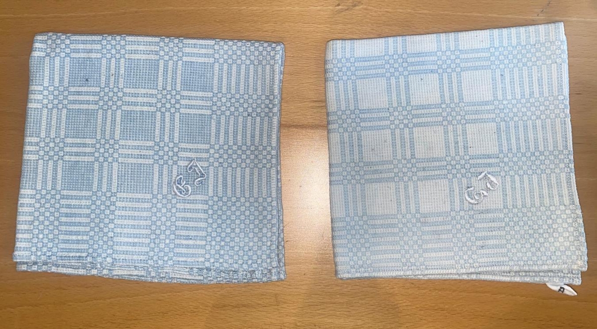 Servíettur ofnar á Kvennaskólanum á Blönduósi. Litir hvítt og ljósblátt. Stafirnir GJ saumað í hornin.