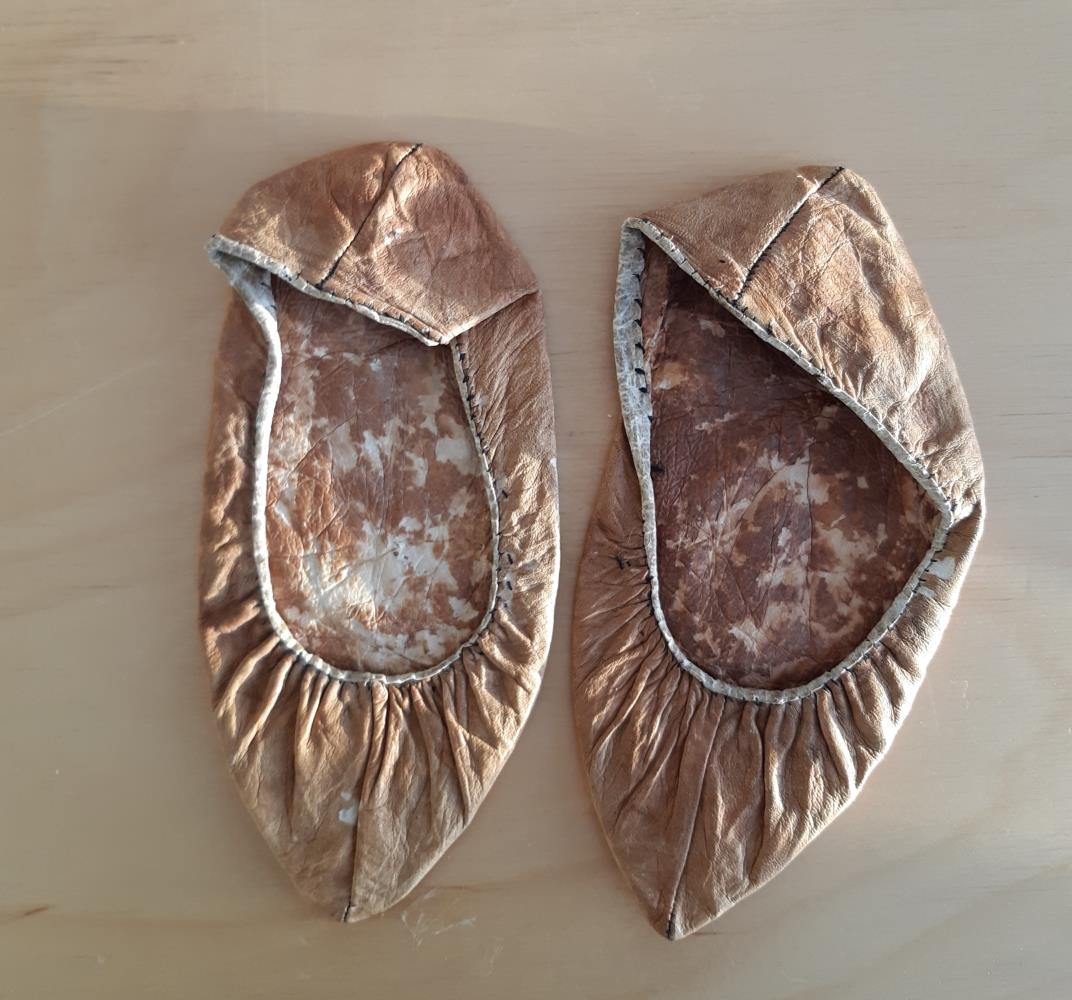 Skinnskór - Litaðir skinnskór (a og b), millibrúnir að lit. Bryddaðir með hvítu slimni.