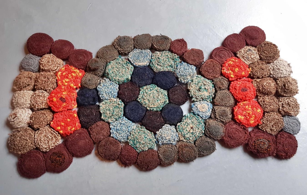 Motta - Motta gerð úr upprúlluðum dúllum í ýmsum litum. Miðja mottunnar er úr 42 dúllum sem mynda hring en til beggja hliða er hálfhringur gerður af 19 dúllun hvor. - Saga: E.S. : Komin frá Elísabetu Guðmundsdóttur frá Gili, Svartárdal. Líklega unnar af dóttur hennar. ATH. Eftir sögu Ingibjargar Andrésdóttur frá Síðumúla þá gerði Elísabet svona mottur.
