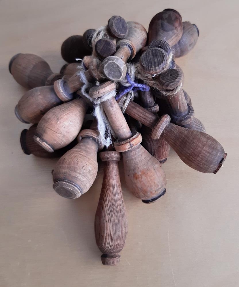 Knipplistokkar/knipplpinnar - litlir úr viði. - Saga: Á miða: "Knipplistokkur Sigurlaugar ömmu minnar í Ási í Vatnsdal." Þetta eru 21 knipplstokkar, flestir eins, utan tveir sem eru aðeins öðruvísi.