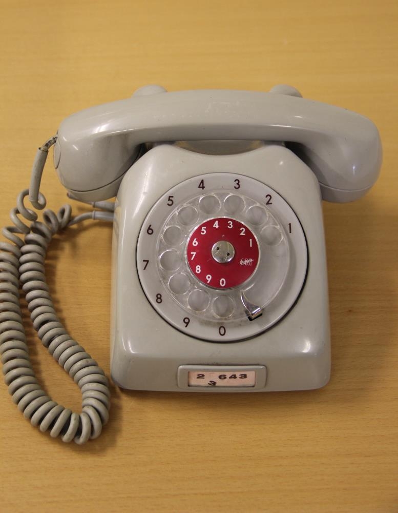 Síminn er grár að lit með plastskífu og rauðri miðju með hvítum tölustöfum og aftur svörtum stærri í kassanum sjálfum. Númer símans er: 23643. Merki: L. M. Ericsson. Made in Sweden.
