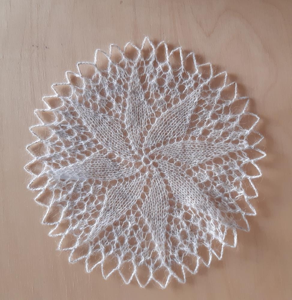 Dúkur, prjónaður úr hvítu ullarbandi.
