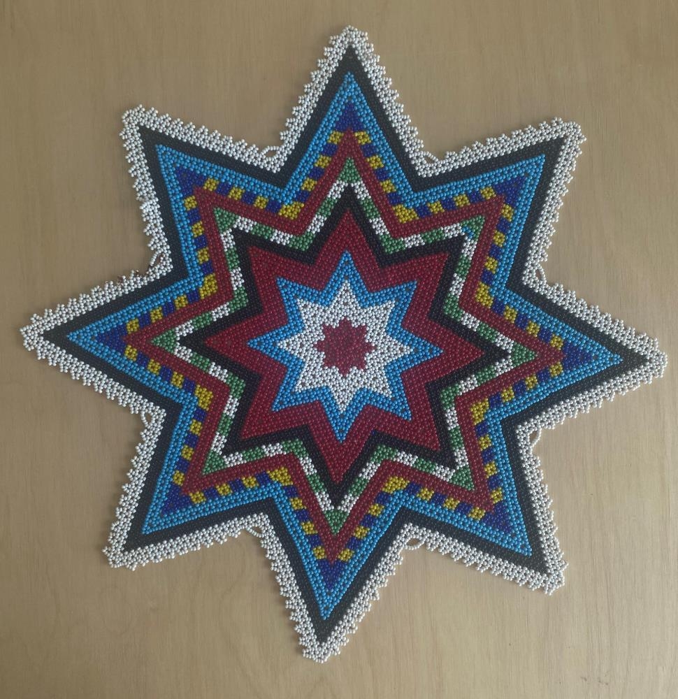 Stjörnulagaður dúkur gerður úr perlum. Ysta röndin er hvít, þá svört, blá, gul og blá, rauð, græn og hvít, svört, rauð, blá, hvít og innst er rauð stjarna. Dúkurinn minnir á íslenska heklaða dúka og fyrst og fremst varðveittur með tilliti til þess og rannsóknarmöguleika á íslensku og grænlensku handverki.
