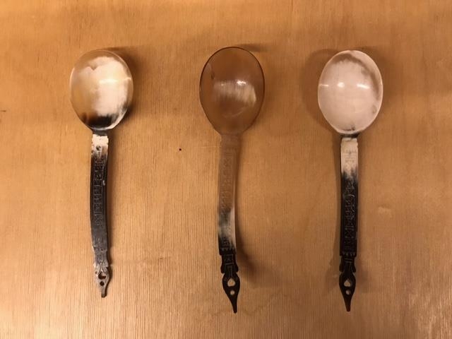 Spænir - Spænir 3 stk. Allir úr kýrhorni. A) Skaftið er svart og skeiðin er hvít B) Spónninn er nánast glær nema yrst á skaftinu það er svart. C) Skaftið er svart og skeiðin er hvít og glær. Á öllum sköftunum er útskorið með höfðaletri. Á því stendur: "Island". Í kring er skraut og trúlega allt eftir þann sama. - Saga: Bændasamtök Íslands afhentu til varðveislu árið 2003 muni Halldóru Bjarnadóttur sem hún hafði gefið BÍ árið 1962. Þessir munir voru í sýningarskápum fyrir framan skrifstofur Bændasamtaka Íslands.