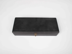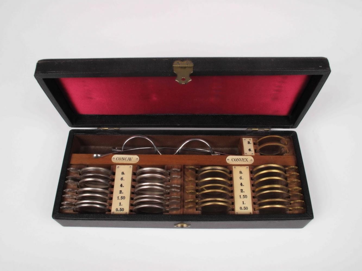 Augnglerjakassi úr viði, klæddum svörtum shirting fóðraður rauðu silki, kræktum aftur með 1 látúnsspennu. Ómerktur að gerð Aesculap C-100. Í honum eru 7 pör af Concau og Convex glerjum (0.5-8) og 2 önnur (3.6) og prófglerjahalda úr stáli eins og Stille 1945, H5, 1660, 1 Provåge med fjädrande fattning och enkla spår. Eftirfarandi tæki Árna Árnasonar afhenti Jón Baldvinsson úr dánarbúi Agnesar Sigríðar Guðmundsdóttur.