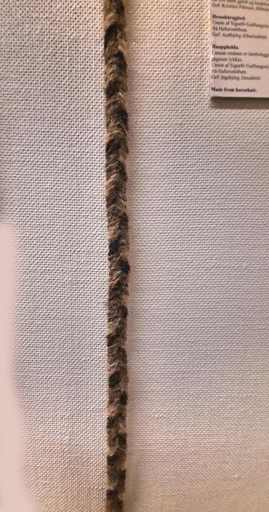 Hnapphelda - A og B. Hnappelda brugðin úr hrosshári. Lambsleggur (b) í annan endann til að bregða í gegn um lykkju. - Saga: Hlutinn gerði Sigurður frá Hafursstöðum Gefandi Ingibjörg Jónsdóttir á Blönduósi Komudagur júní 1999