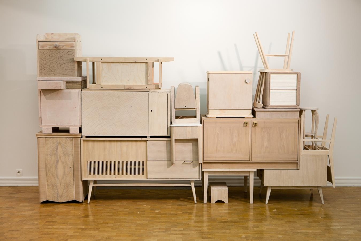 Áferð og bygging eru veigamiklir hlutar skúlptúrsins Yfirborð – mannvirki, sem gerður er úr fundnum húsgögnum. Húsgögnin hafa einhvern tíma tilheyrt búslóð en hér eru þau heild þar sem form og bygging mynda einingu listaverksins. Þegar verkinu er gefinn nánari gaumur verður glíman við áferð og yfirborð hlutanna augljós. Yfirborðið minnir á húð eða himnu sem umlykur verkið þannig að heild þess og eining verða sem einn samfelldur líkami.