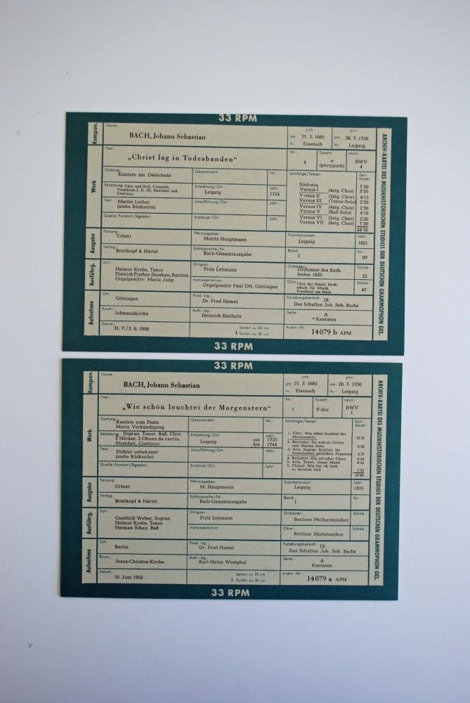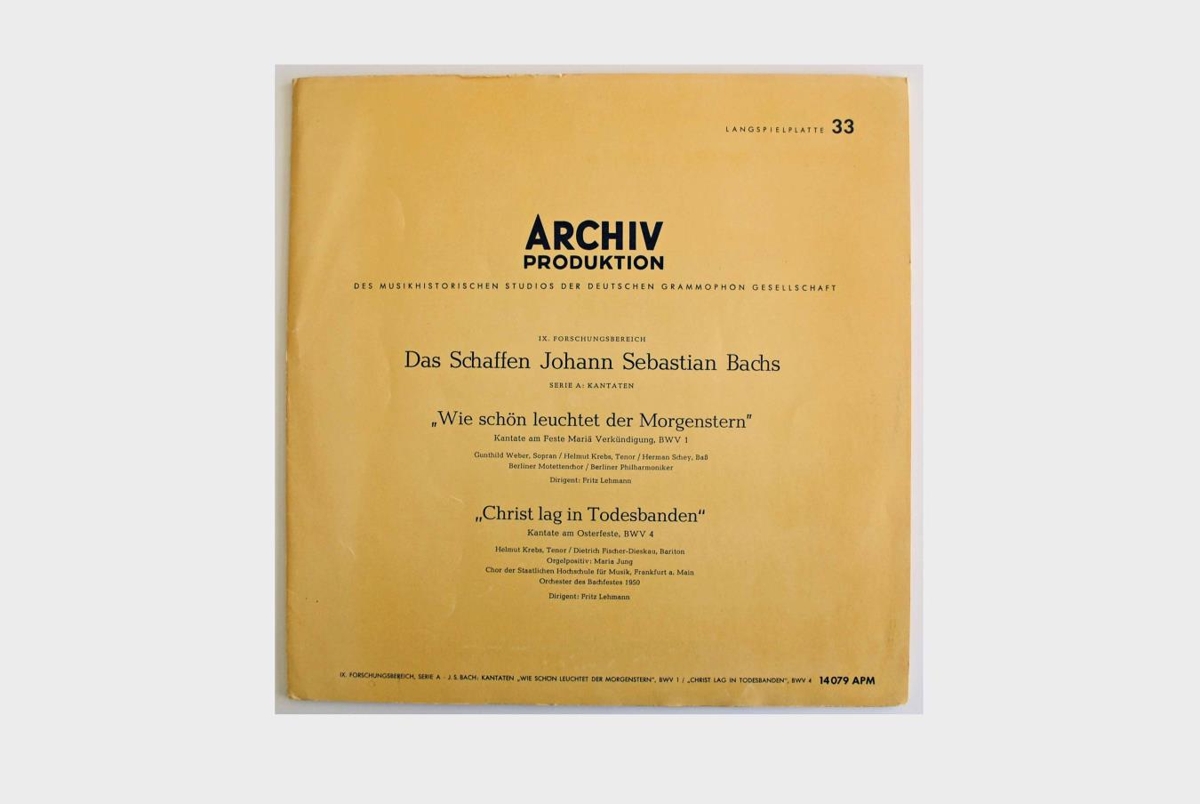 ,,Christ lag in Todesbanden" Kantate am Osterfeste, BWV 4 í flutningi Helmut Krebs tenórs, Dietrich Fischer-Dieskau baritóns, Mariu Jung orgelleikara, Chor der Staatlichen Hochschule für Musik, Frankfurt a. Main og Orchester des Bachfestes 1950 undir stjórn Fritz Lehmann.