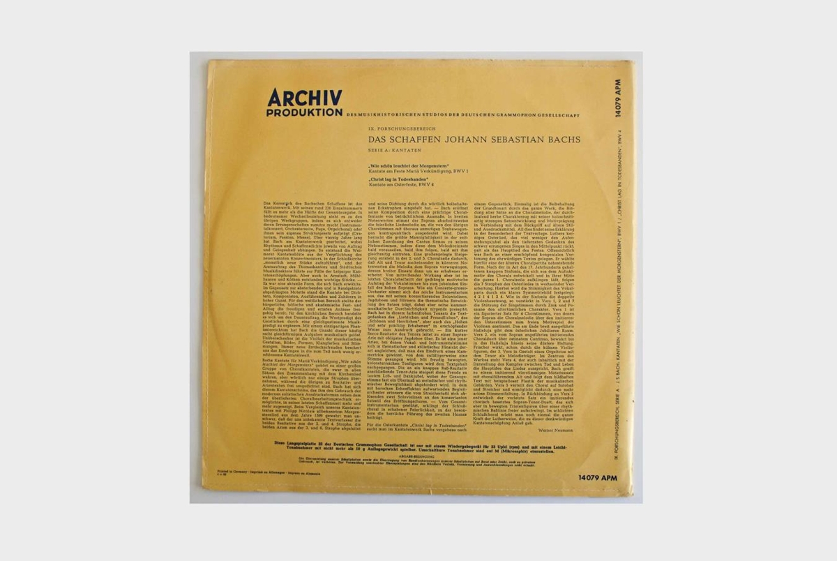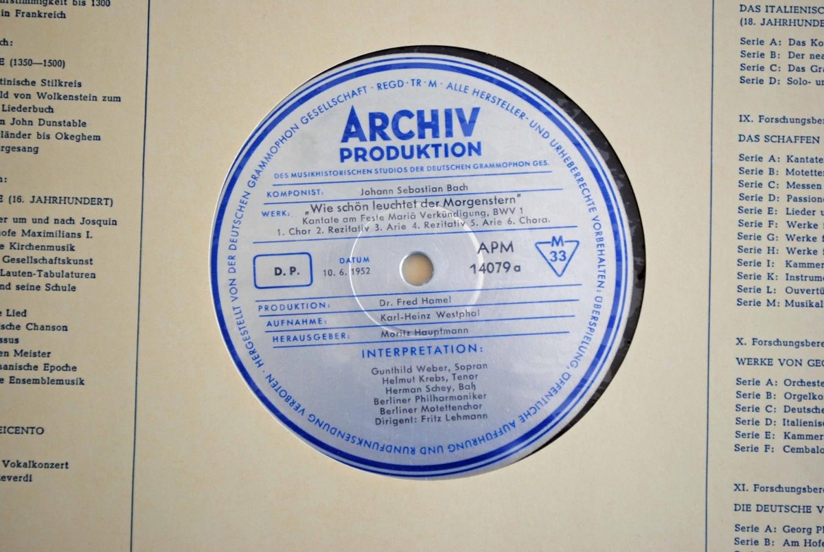 ,,Wie schön leuchtet der Morgenstern" Kantate am Feste Mariä Verkündigung, BWV 1 í flutningi Gunthild Weber sóprans, Helmut Krebs tenórs, Herman Schey bassa, Mótettukór Berlinar og Berlínarfílharmóníunnar undir stjórn Fritz Lehmann.