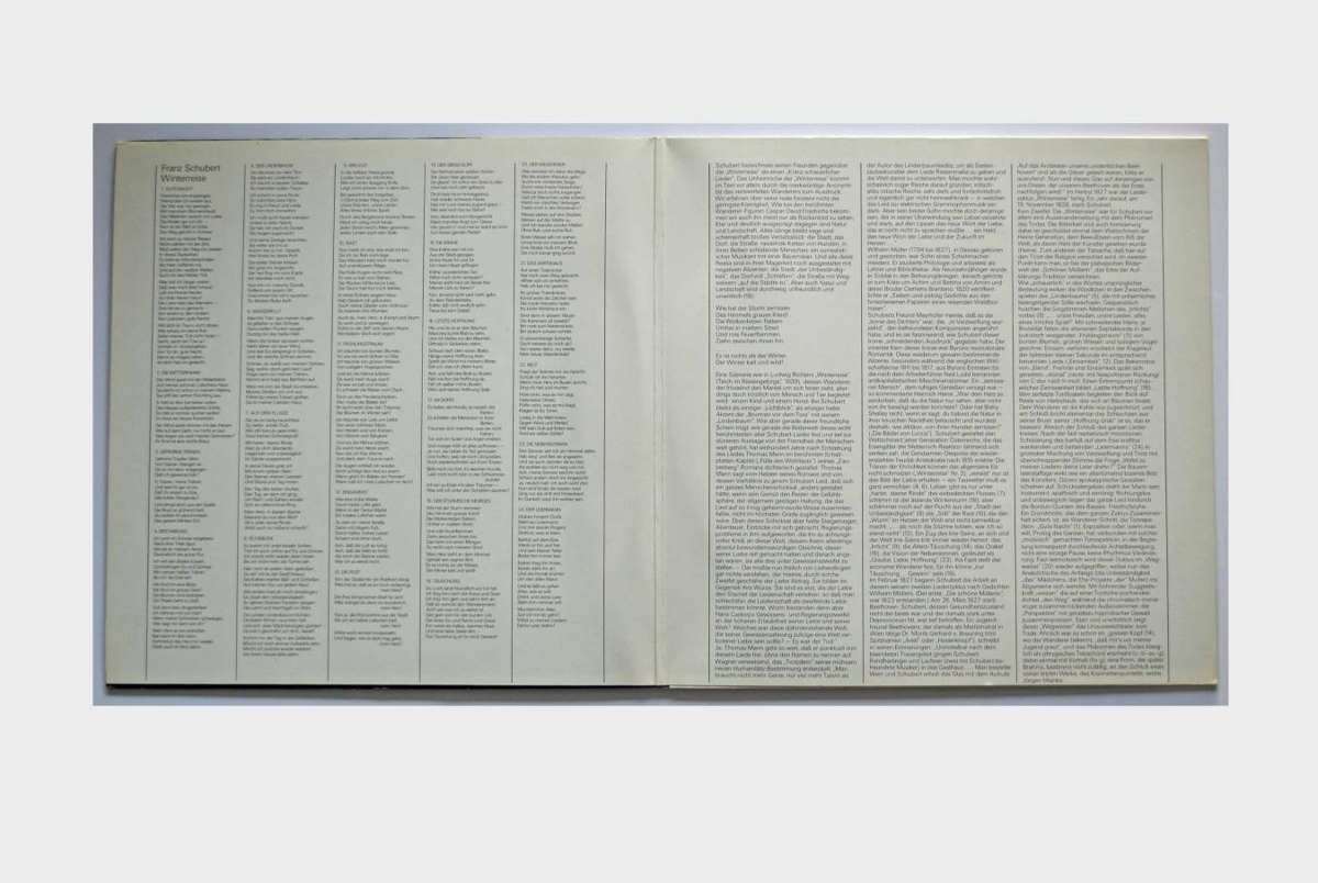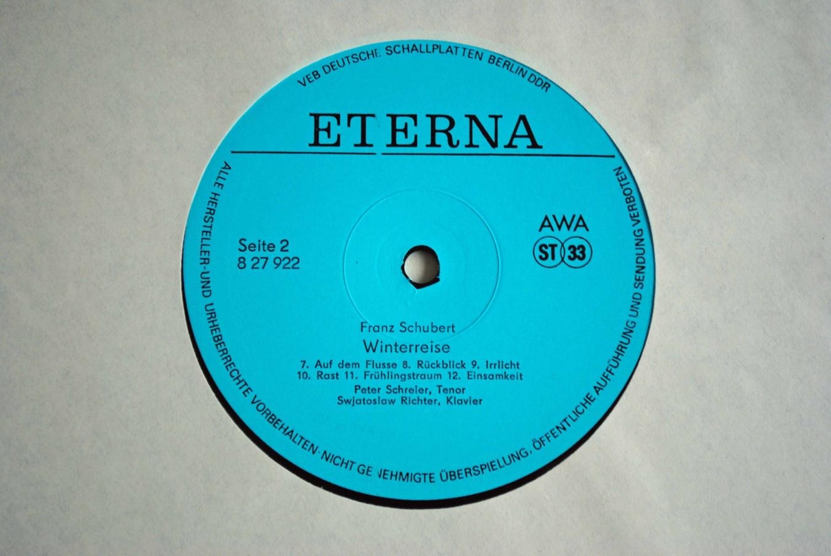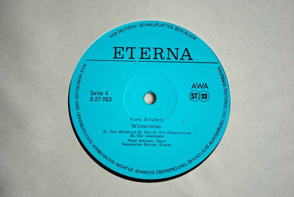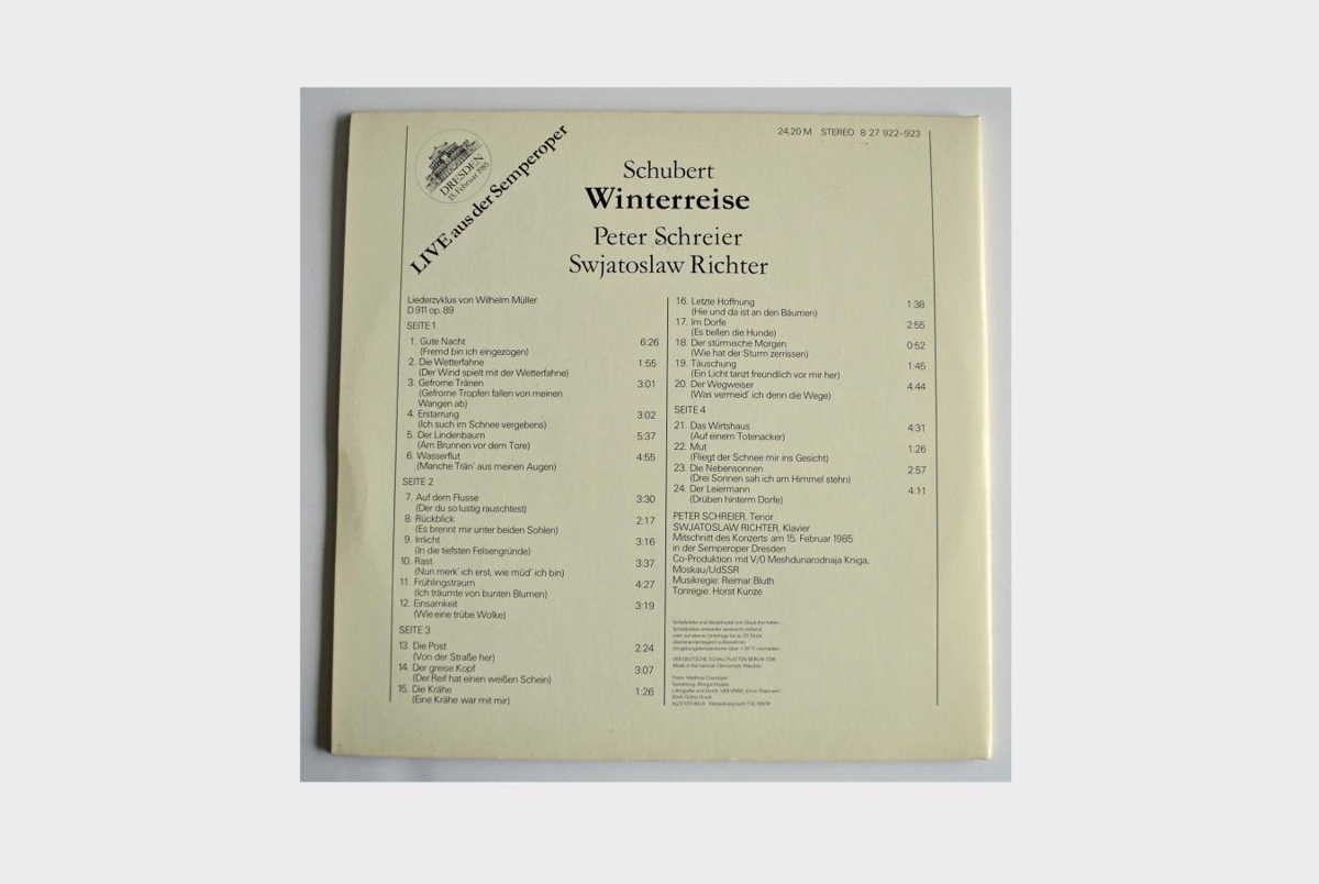 Peter Schreier, tenór, og Sviatoslav Richter, píanóleikari, flytja Winterreise eftir Franz Schubert. Upptaka frá tónleikum í Dresden 15. febrúar 1985. Verkið er á tveimur 12 tommu hljómplötum.