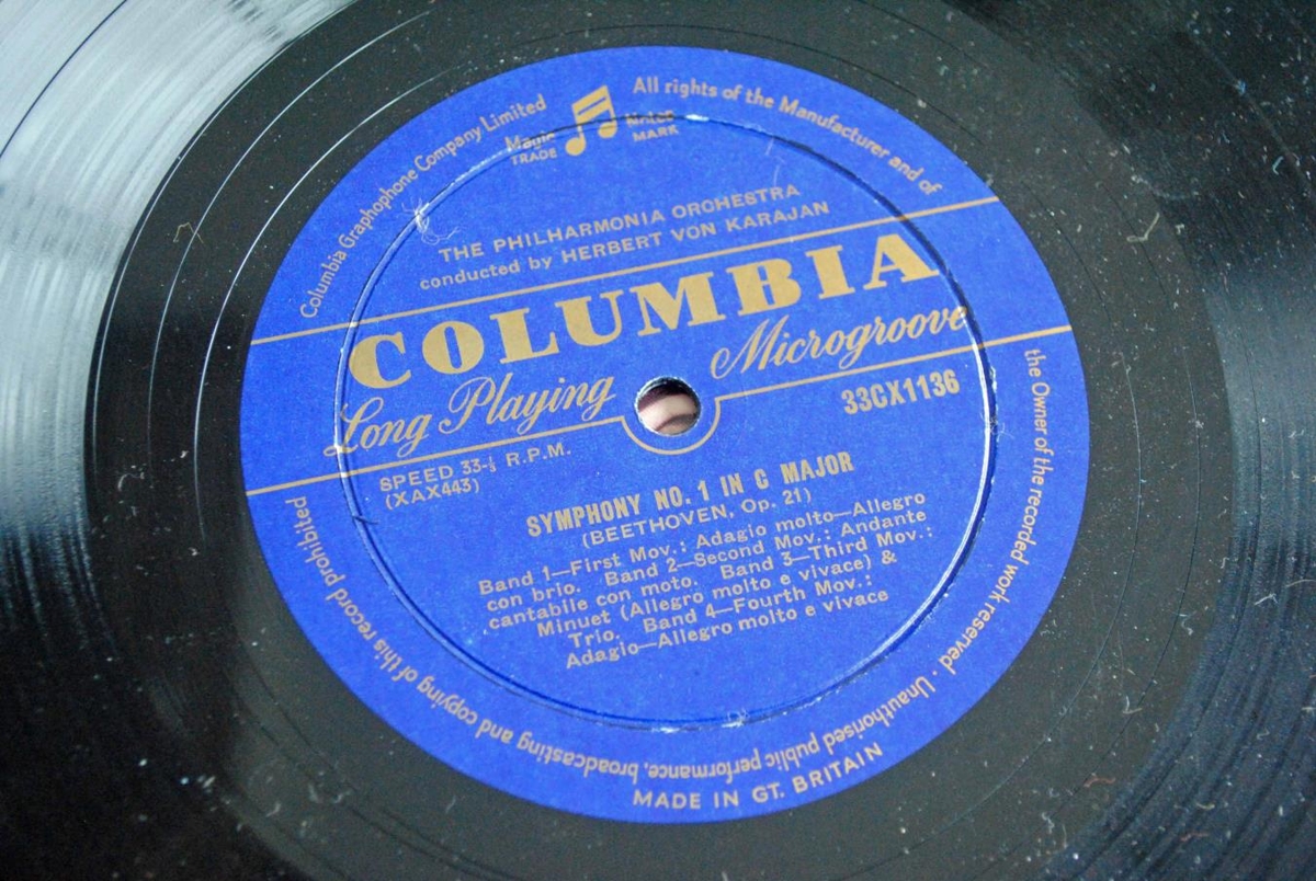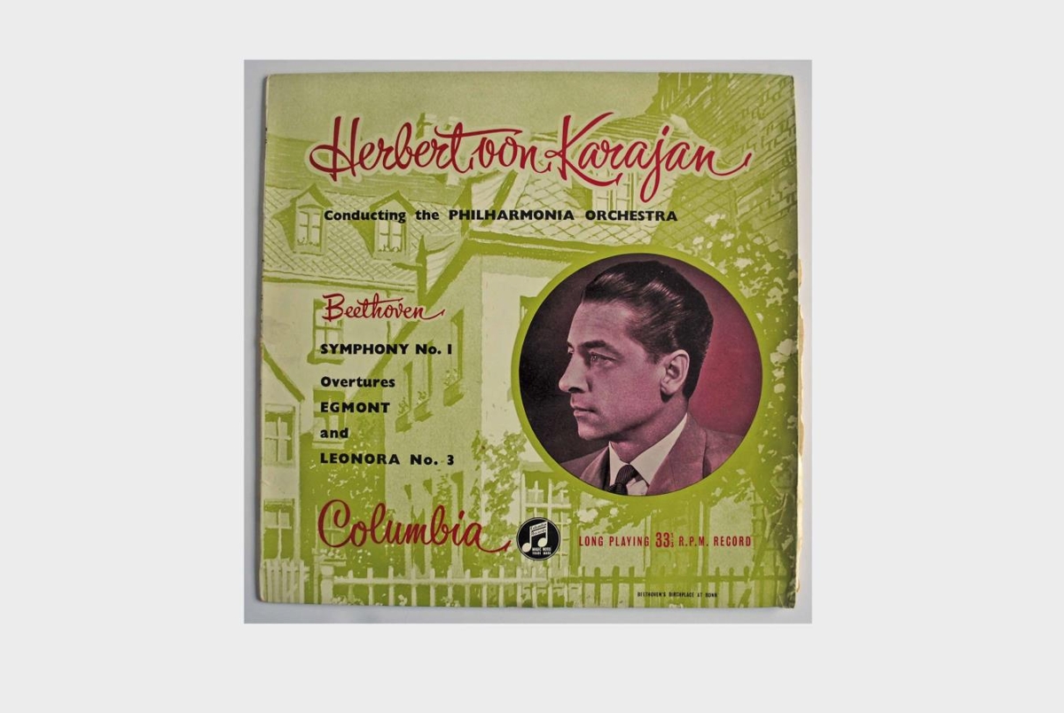 Herbert von Karajan stýrir Fílharmóníunni í flutningi á fyrstu sinfóníu Beethovens og tveimur forleikjum, Egmont og Leonora nr. 3.