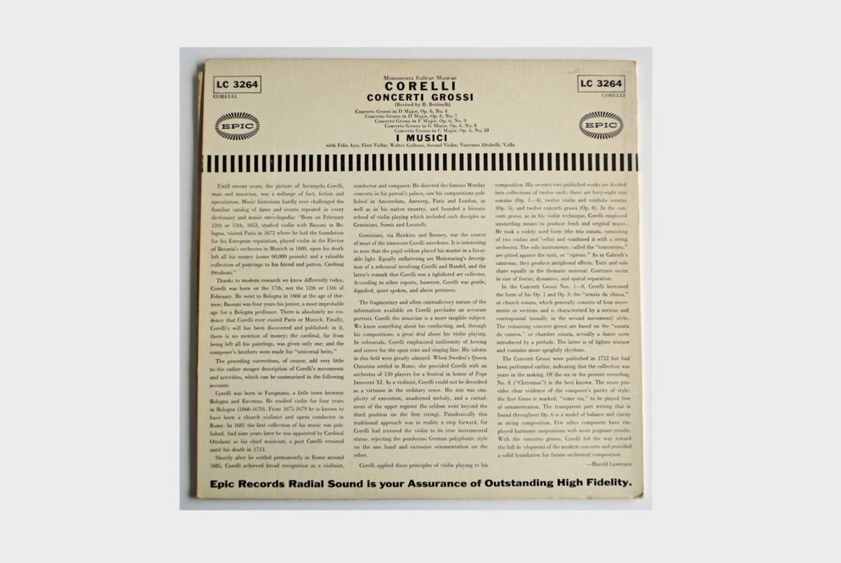 I Musici leikur Concerti Grossi eftir Corelli. Fyrsta fiðla: Felix Ayo. Önnur fiðla: Walter Gallozzi. Selló: Vincenzo Altobelli.