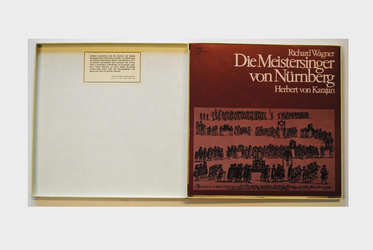 Meistarasöngvararnir frá Nurnberg eftir Wagner í stjórn Herberts von Karajan. Hljómsveitin er Dresten State Orchestra og meðal einsöngvara eru: Theo Adam, Helen Donath, Geraint Evans, Ruth Hesse, Zoltan Kelemen, Rene Kollo, Karl Ridderbusch og Peter Schreier. Verkið er á fimm 12 tommu hljómplötum í kassa.