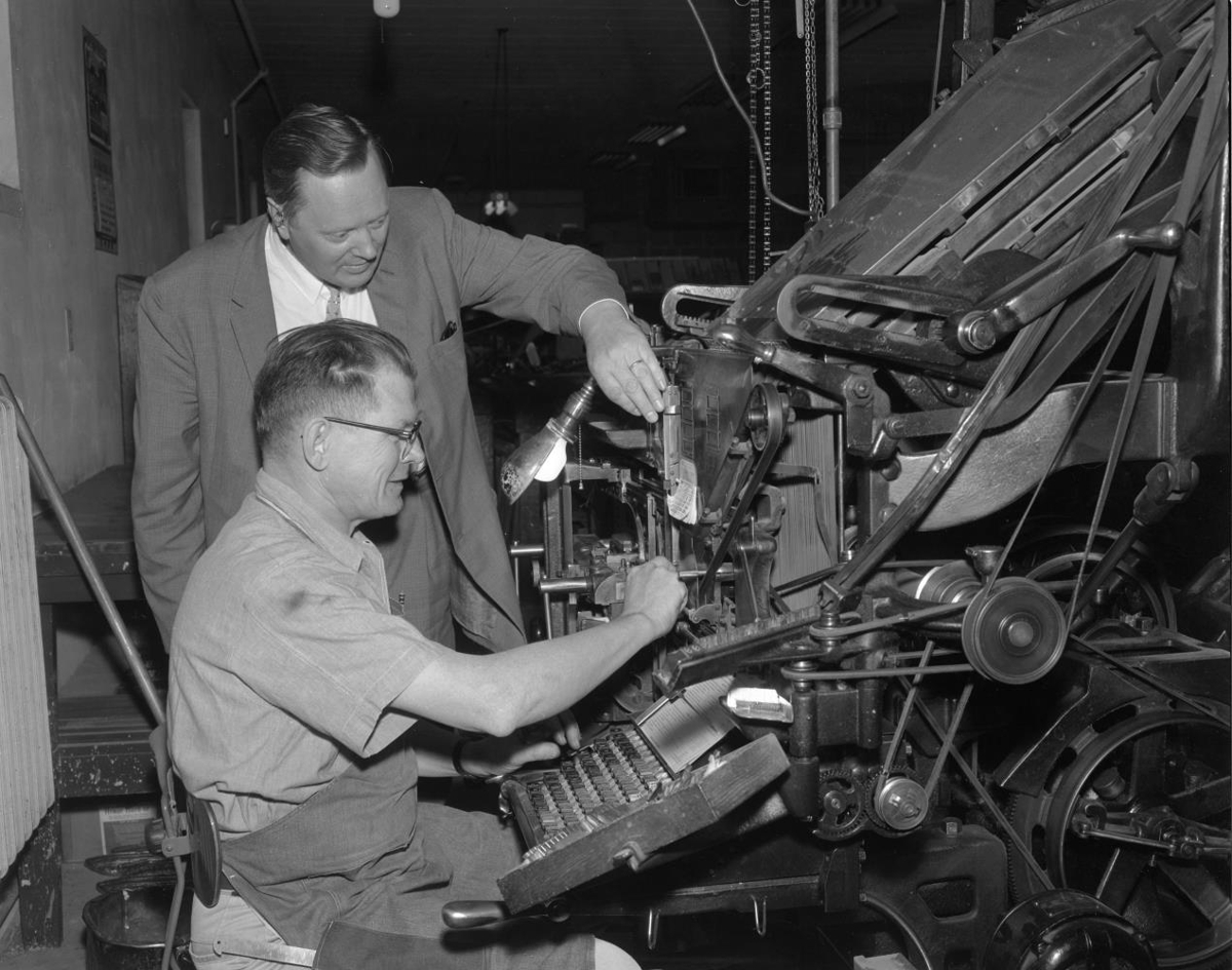 Andrés Kristjánsson, ritstjóri, fylgist með setjara við störf í Ameríkuferð íslenskra blaðamanna.