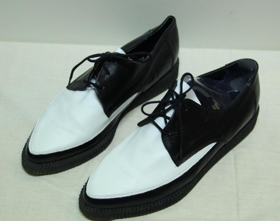 Skórnir eru svartir og hvítir úr leðri. Hvítir að ofan en svartir á hliðum. Þeir eru reimaðir. Sólinn er svartur. Á botn sólans er stimplað: Act - High quality. Stærð: 41.