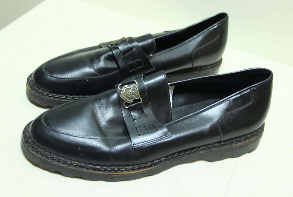 Skórnir eru svartir með skrautspennu sem á stendur: Royal airforce. Sólinn er svartur. Texti: Made in Portugal. Texti í skóbotni: Act - Stærð 45.