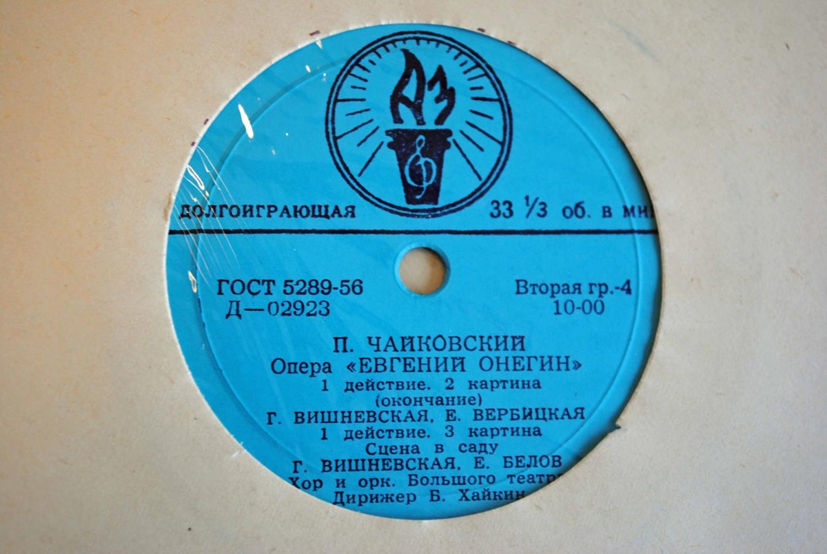 Eugene Onegin eftir Thcaikovsky í flutningi Bolshoi Theatre Orchestra undir stjórn B. Haikin. Óperan er á fjórum 12 tommu hljómplötum.