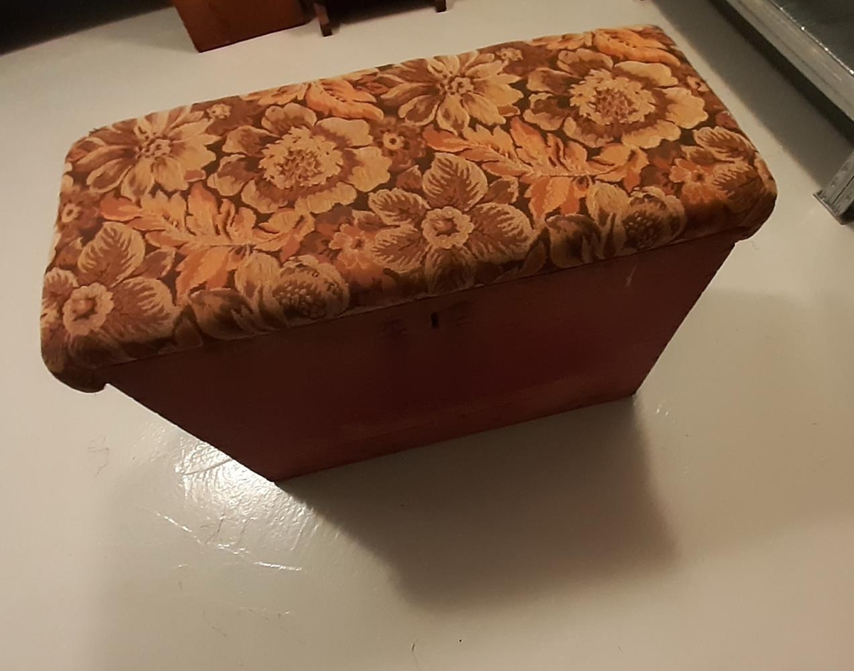 Koffort - Rauðmálað viðarkoffort með handföngum (okum) á hliðum. Lokið er stoppað með rósóttu áklæði. - Saga: Úr eigu Guðrúnar Björnsdóttur frá Mánaskál. Hún fæddist árið 1854 og lést 1946. Guðrún Sigurðardóttir er dótturdóttir hennar.