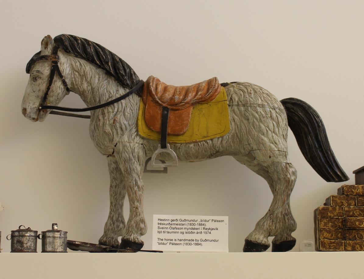 Saga: Guðmundur 'bíldur' Pálsson tréskurðarmeistari (1830-1884) skar hestinn út. Þuríður Sæmundsen (1894-1967) kennari og síðar bóksali á Blönduósi keypti hann á uppboði á Hjallalandi í Vatnsdal, sennilega þegar Jórunn Jósefsdóttir brá búi skömmu eftir andlát beggja foreldra hennar sama ár, 1926. Þuríður, sem var tengdadóttir Magdalenu Möller Sæmundsen, gaf syni sínum Pétri Sæmundsen hestinn. Sveinn Ólafsson myndskeri í Reykjavík bjó til tauminn og ístöðin árið 1974. Afhentur safninu af ekkju Péturs, Guðrúnu Sæmundsen (1926-2020). Hlutinn gerði Guðmundur 'bíldur' Pálsson Komudagur ágúst 2005.