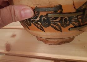 Skál - Spengd á 7 stöðum, litur gulur, með svörtum rósabekk í guldröppum lit í miðju. - Saga: Þetta er súpuskálin hans Davíðs Einarssonar hreppstjóra, sem bjó á Marðarnúpi. Síðan eignaðist hana sonur hans Davíð Davíðsson, sem bjó á ýmsum jörðum í austan verðum dalnum, og skálin varð síðan aðal matarílát sonar hans Daða Davíðssonar, á Gilá. Gef. Marteinn Á. Sigurðsson, f. 17.10.1923.