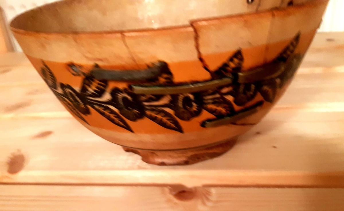 Skál - Spengd á 7 stöðum, litur gulur, með svörtum rósabekk í guldröppum lit í miðju. - Saga: Þetta er súpuskálin hans Davíðs Einarssonar hreppstjóra, sem bjó á Marðarnúpi. Síðan eignaðist hana sonur hans Davíð Davíðsson, sem bjó á ýmsum jörðum í austan verðum dalnum, og skálin varð síðan aðal matarílát sonar hans Daða Davíðssonar, á Gilá. Gef. Marteinn Á. Sigurðsson, f. 17.10.1923.