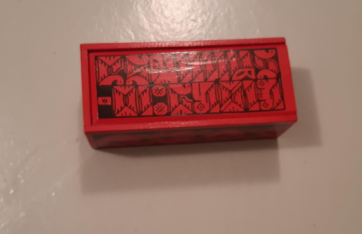 Rauðmálaðurkassi með svörtum grunni á hliðum og enda með rauðu munstri. Líkist dreka með gulum doppum hér og þar. Rennilok rautt með svartri áletrun (höfðaletri) nafnið Björg Jóhannesdóttir. Ómálaður að innan.