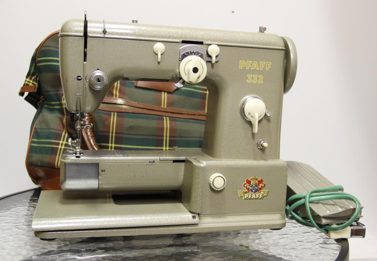 Pfaff 332 saumavél með ýmsum bæklingum. Hún er rafmagnsknúin. Henni fylgir köflótt taska.