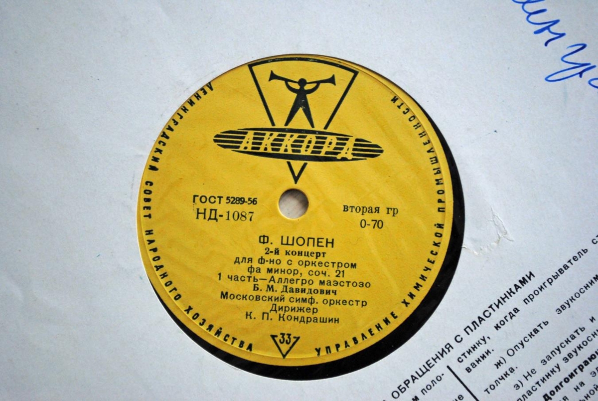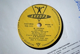 Píanókonsert nr. 2 í F dúr eftir Chopin í flutningi Sinfóníuhljómsveitar Moskvu. Allar upplýsingar á plötunni eru á rússnesku. Platan er í bláa hljómplötukassanum. Á plötunni er rússnesk áletrun sem líklegast þýðir: "Halldór Laxness, erlendur gestur". Mögulega hefur platan verið skilin eftir fyrir Halldór á hóteli á einni af ferðum hans til Sovétríkjanna.