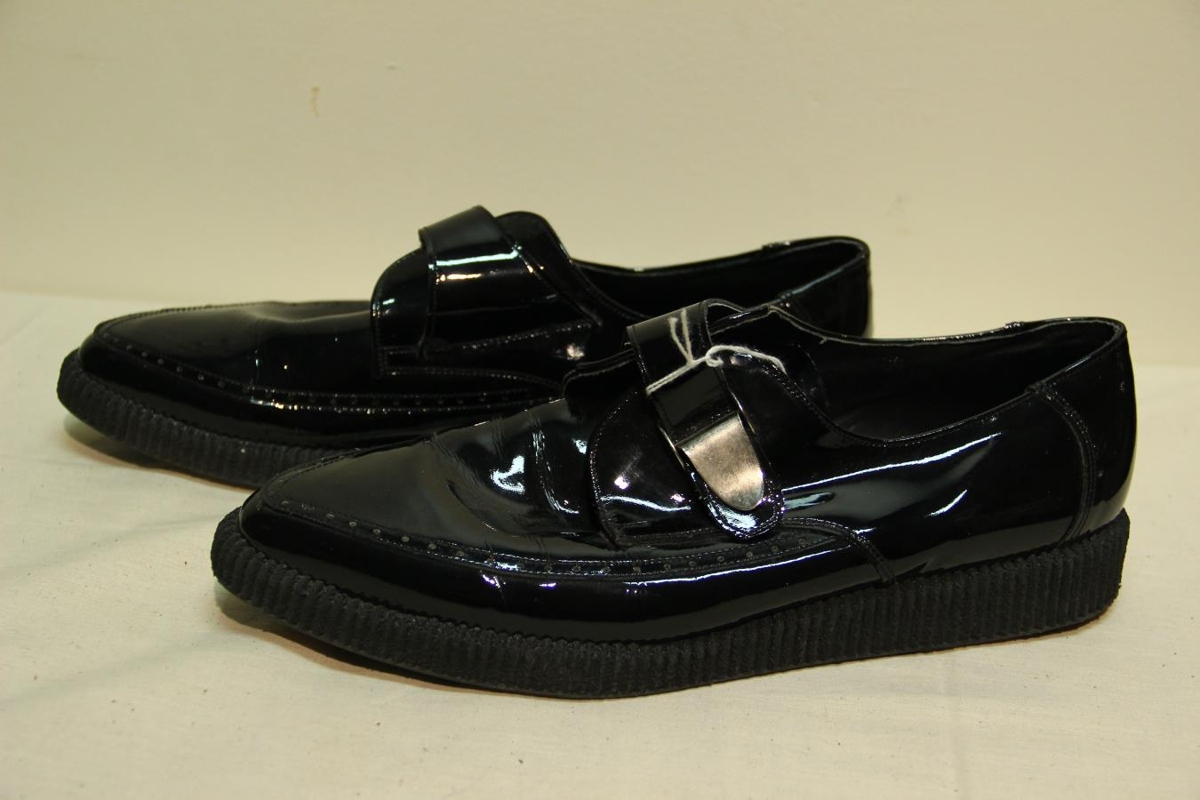 Svartir lakkskór. Á skóbotninum stendur: Act - High quality. Eigandi var Einar Gunnar Jónsson, sem lengi vann hjá Olís. En dóttir hans, Hafdís Einarsdóttir, gaf Iðnaðarsafninu á Akureyri skóna.