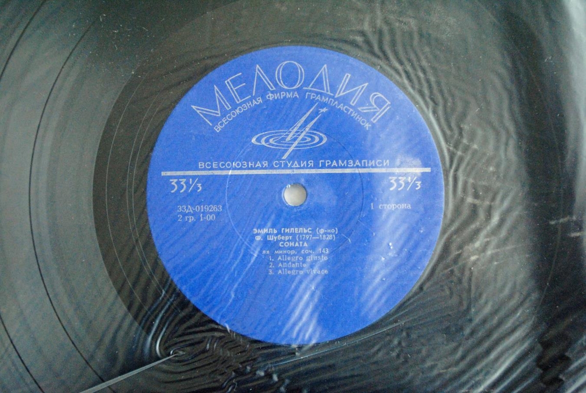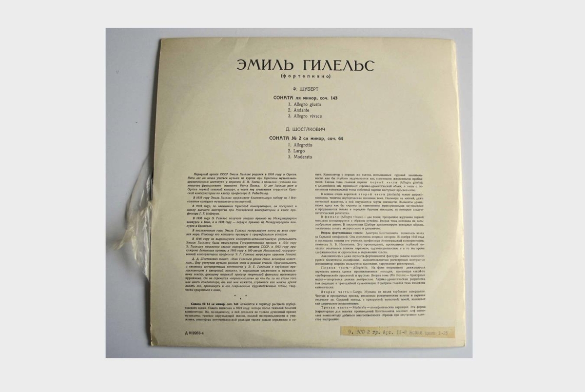 Emil Gilels, píanóleikari, leikur Píanósónötu í A- dúr op. 143 eftir Schubert og Píanósónötu nr. 2 op. 64 eftir Shostakovich. Allar upplýsingar á plötunni eru á rússnesku. platan er í bláa hljómplötukassanum.