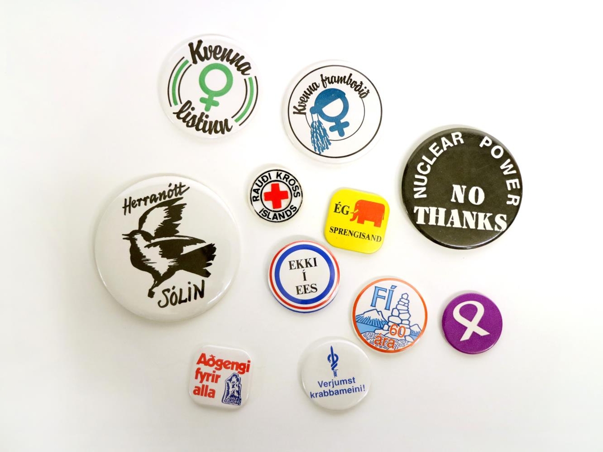 Safn barmmerkja með margskonar áróðri eða áletrunum. Merkin eru 11 talsins og mismunandi að stærð og lögun: