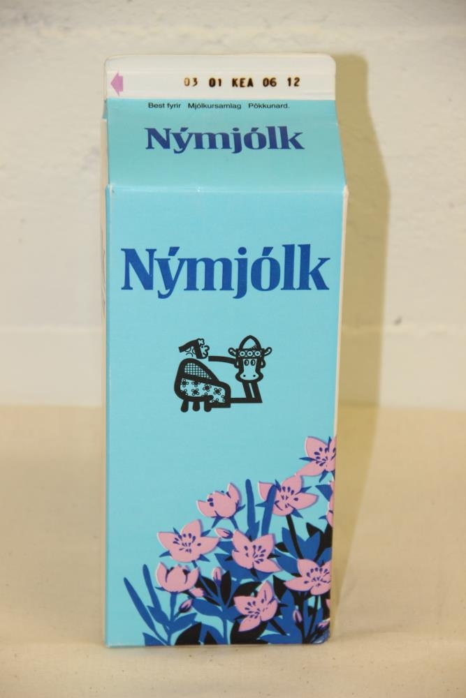 Ljósblá ferna með dökkbláu letri. Texti: Nýmjólk - Auðhumlumerkið - mynd af bleikum blómum með bláum laufblöðum - og innihaldslýsing. Elopak framleiddi fernurna. Um umbúðirnar er sagt: "Umbúðirnar eru framleiddar úr óbleiktum pappa, rakavarðar með hreinu pólýetenplasti. Rannsóknir sýna að þær megi jafnt endurvinna sem brenna til orkuvinnslu". Stærð: 2 lítrar.