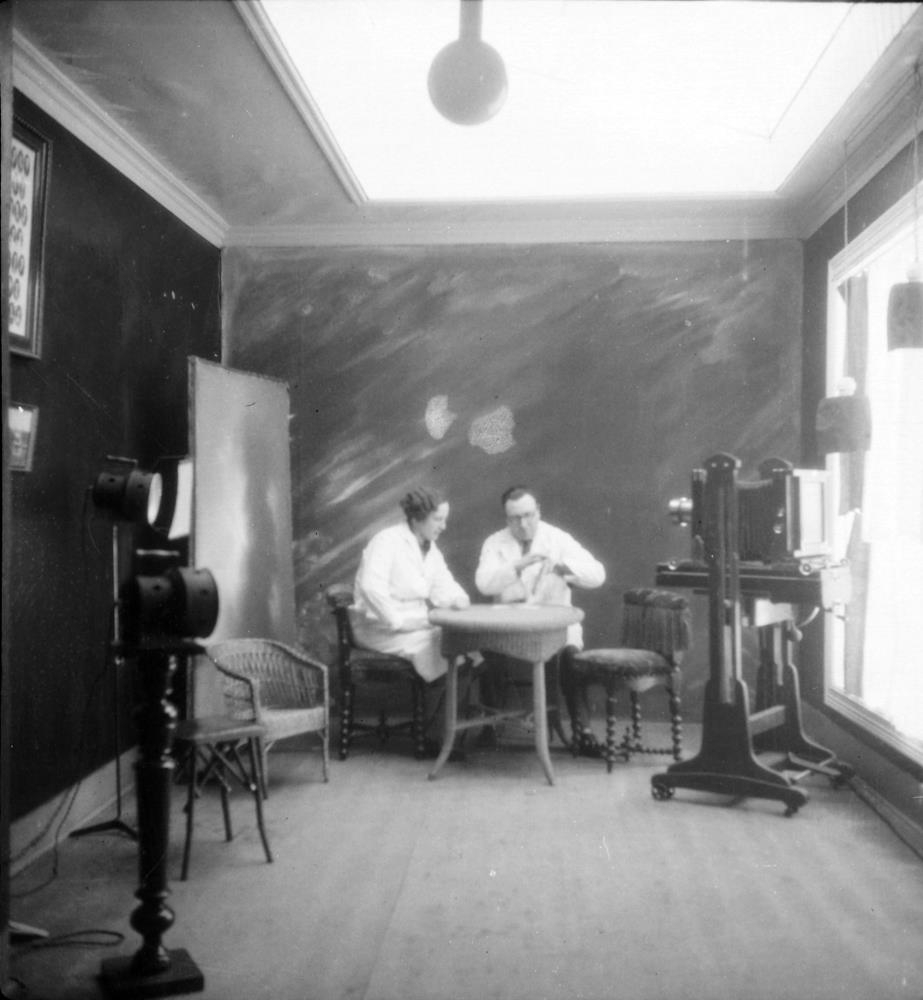 Ljósmyndastofa Jóns Sigurðssonar Strandgötu 1. Jón að störfum, ásamt aðstoðarkonu.
