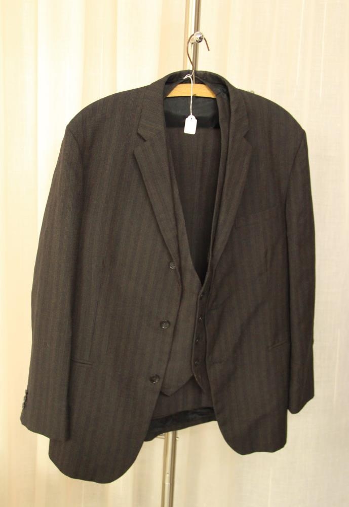 Dökkbrún teinótt jakkaföt með vesti. Jakki, buxur og vesti eru í sama lit. Texti í ísaumuðu merki: "Saumastofan Gefjun Akureyri".